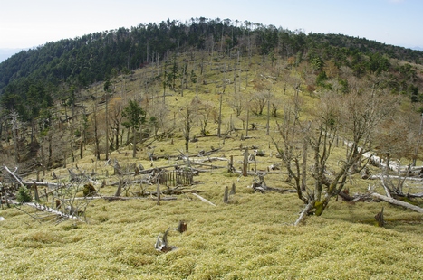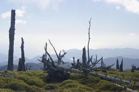 紅葉を撮影といいたいところですが、先日の台風で葉っぱが吹き飛ばされ山頂はほぼ終わってました 大台ケ原ドライブウェイ途中で 駐車場入口 朝八時で駐車場は8割埋まってました 大台ケ原といえばこういう枯木が建つイメージだと思います 尾鷲湾を望む 地面は笹です しかし、こういう風景になったのは40年ほど前からだそうです コケの写真も ピントをコケの上の落ち葉に合わせたはずが・・甘くなってました 昔は木に覆われで地面にはコケが覆いうっそうとした森だったそうです 伊勢湾台風で多くの木が倒れたので倒れた木を運び出したら地面に光が降り注ぐようになって乾燥化が進みコケがなくなり笹が一面増えたそうです そして鹿が増えたため(保護や日本狼が絶滅したから)が、観光客が増えたため悪化が進んでます (マナーを守らないハイキング客がたくさんいたので、マナーを守りましょう) よく考えたらすべての原因の根源は人間ですね・・・ 出会った母親の鹿さん 子連れでいましたが子供が見えなくなったら鳴き声を出して呼んでました 続く